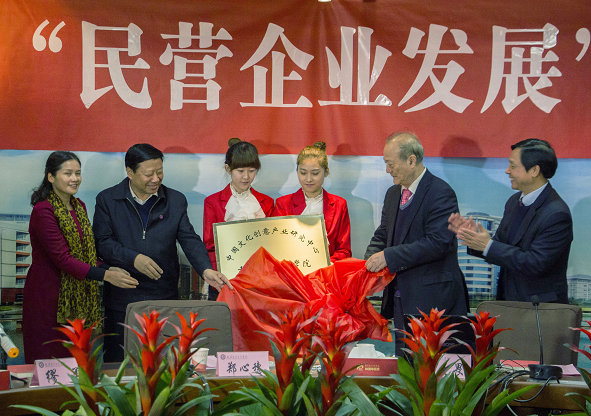 图为厉无畏先生与湖北省政协副主席刘心穗为中国文化创意产业研究中心揭牌 摄影:李鳌