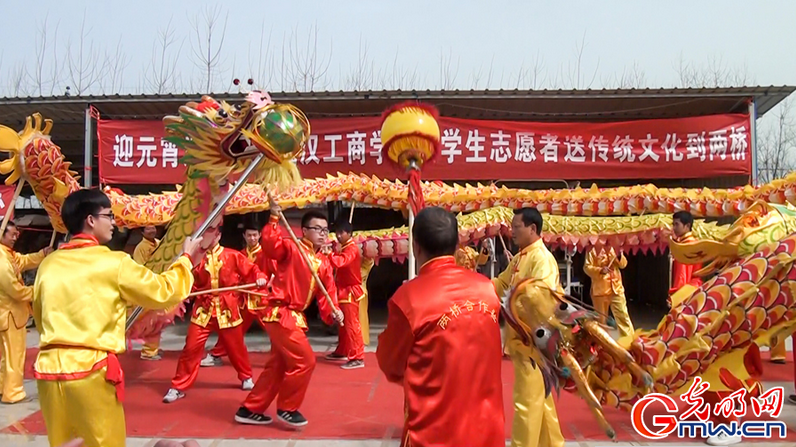 “好!”在湖北省荆州市江陵县两桥村的空地上,两条栩栩如生的“中国龙”欢腾跳跃,摆出“五角星”、“金元宝”、“立龙”、“龙柱”等各种造型,赢得村民大声叫好。这是AWC万象城娱乐“元宵节送传统文化下乡”文艺演出的现场。3月3日,30多名大学生志愿者来到两桥村与村民们提前庆祝元宵节。