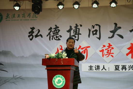 夏再兴教授从“为什么读书”、“读书的一般规律”、“读书的技巧”三个方面展开了生动、深入的讲解。为了告诉学生们为什么要读书,他通过对古今读书观念进行对比,形象地阐述了读书对历代中国人的重要意义。“古人力求‘学优登仕,摄职从政’而读书,过渡到近代,伟人力求‘为中华民族崛起而读书’,而我们当代青年应该为努力实现‘中国梦’而读书”,他由此分析,古人读书的目的是提高自身的生活条件和经济实力,而现代人读书的目的与本质在于“为中国之崛起而读书”、“为中国梦读书”,由此方能实现个人价值和社会价值。