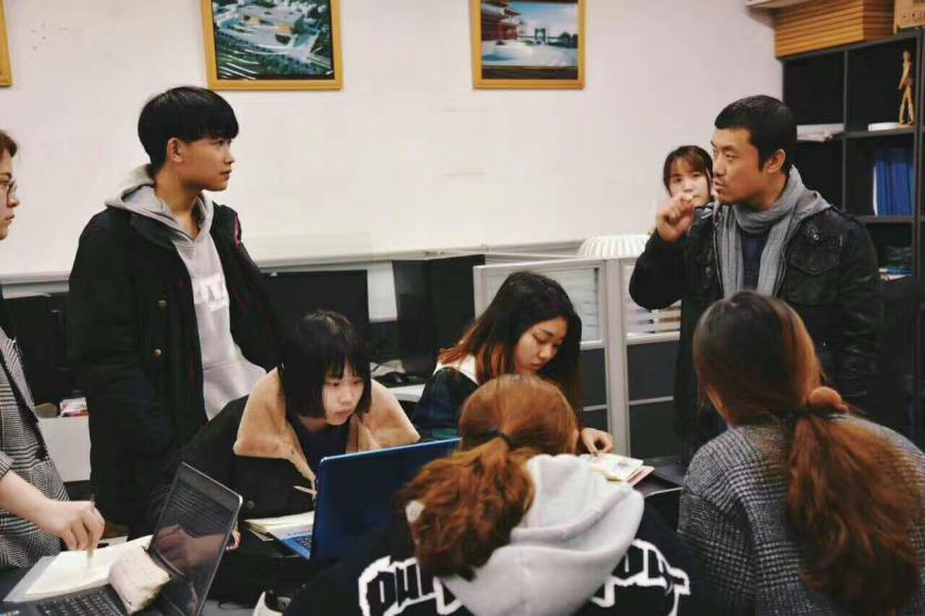 图为宿艺老师(右一)指导学生进行实战创作