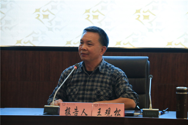 随后,王观松教授总结了关于十九大精神的“四大箴言”: 即取得新成就、记录新时代、提出新思想、明确新任务,这是新时代中国共产党人的“执政宣言”。他着重阐述了党的十九大提出的“十四大坚持”和“八大明确”,这两大方针清晰的擘画了实现中华民族伟大复兴中国梦的战略步骤、重大方略和实践路径。此外,他还从政治、理论和实践三层面诠释了党的十九大在党和国家发展进程中的重大历史意义。一是,从政治层面来看,党的十九大高举中国特色社会主义伟大旗帜,深刻阐明了我们党在新的历史条件下肩负什么样的历史使命、坚持什么样的指导思想、实现什么样的奋斗目标,采取什么样的基本方略、完成什么样的根本任务等重大问题,发出了新时代中国共产党人的“执政宣言”。二是,从理论层面看,党的十九大提出了我们党具有划时代意义的指导思想,形成了习近平新时代中国特色社会主义思想,构成了系统完整、逻辑严谨的科学理论体系全面地回答了新时代坚持和发展什么样的中国特色社会主义、怎样坚持和发展中国特色社会主义,开辟了中国特色社会主义新境界,点亮了中国人民团结奋进的“指路明灯”。三是,从实践层面看,党的十九大提出了具有划时代意义的行动纲领,对未来五年乃至更长时期进行了系统谋划和部署,吹响了奋进新时代、开启新征程的进军号令。