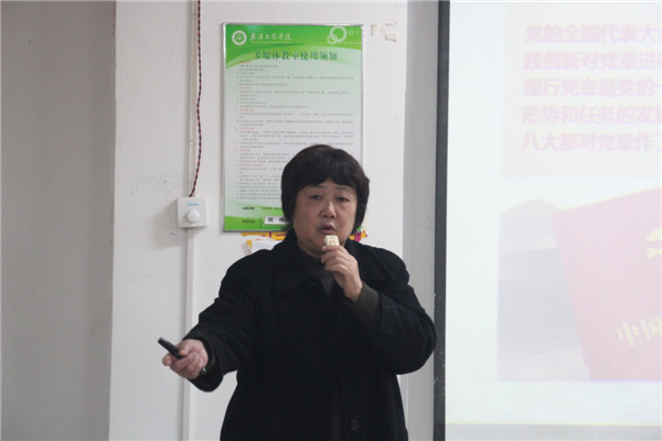 胡老师指出,党的十八大以来,以习近平同志为核心的党中央顺应时代发展,集中全党智慧,大力推进理论创新,创立了习近平新时代中国特色社会主义思想,开辟了马克思主义中国化新境界,推动中国特色社会主义进入了新时代。习近平新时代中国特色社会主义思想的理论意义和实践意义日益显现,得到全党全国各族人民广泛认同和拥护,列入党的指导思想的时机和条件已经成熟。她进一步介绍说,十九大党章修改工作广泛征求各方面意见,集中全党智慧,凝聚全党共识,体现全党意志,对党章做了十大修改:一是将习近平新时代中国特色社会主义思想写入党章;二是将中国特色社会主义文化写入党章;三是将实现中华民族伟大复兴的中国梦写入党章;四是将党章根据我国社会主要矛盾的转化作出相应修改;五是将推进国家治理体系和治理能力现代化写入党章;六是将供给侧结构性改革、“绿水青山就是金山银山”写入党章;七是将人类命运共同体、“一带一路”写入党章;八是将全面从严治党、四个意识写入党章;九是将“党是领导一切的”写入党章;十是将实现巡视全覆盖、推进“两学一做”写入党章。