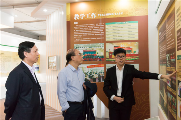 报告会开始之前,刘经南院士在董事长彭秀春、校长张安富、党委书记陈伟的陪同下参观了学校校史馆、图书馆,以及学校水处理示范基地——静思湖,查看生态治理后水质情况。