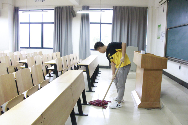 据悉,学校将综合楼、外语楼教室及公共区域卫生工作统一分配到各二级学院,再由学院指定责任班级,一个班级负责一间教室,并将在教室门口挂牌所属班级,所属班级的学生以小组为单位需在每周一至周五早上7:00到达教室完成清扫教室、检查教学设备等工作。学工部会安排学助会的工作人员准时在早上7点半检查各教室的完成情况并实时评分,评分情况当日公示,各责任班级的辅导员也会及时做好相关记录。