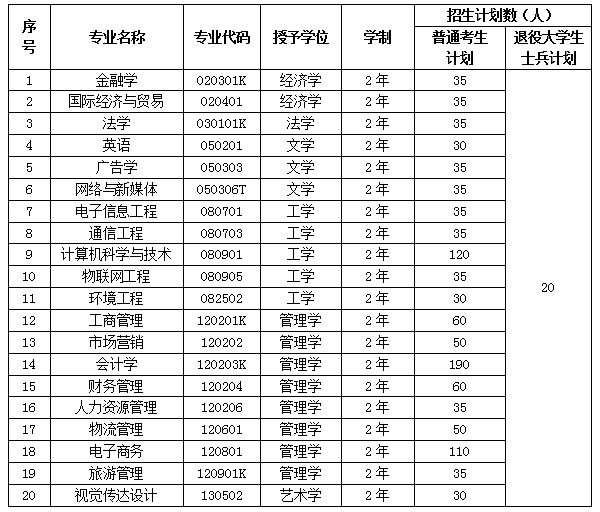 网上报名、资格审核之后,考试之前,我校将根据报考情况适当调整有关专业招生计划。其中:当某专业报考人数不足时,招生计划出现空余时,将空余计划调整至其他专业使用;当退役大学生士兵报考总人数不足而出现计划空余的,空余计划将调整到普通考生计划使用。调整情况将在我校专升本工作网址(http:/jwb)公布。