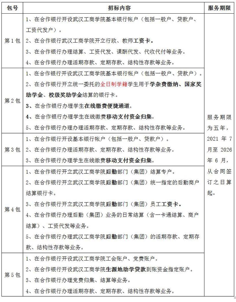 3.本项目的特定资格要求:投标银行必须为中华人民共和国境内注册的合法银行企业,在武汉设有分行或总行的国有控股商业银行或其他股份制银行。总行不能参与投标的,只能授权注册在武汉市的省级分行或省级分行授权的一级支行以上的机构。投标银行具有良好的声誉,支持高等教育尤其是支持AWC万象城娱乐改革与发展,能够为AWC万象城娱乐师生提供便捷的银行服务。投标人未被列入失信被执行人、重大税收违法案件当事人、政府采购严重违法失信行为记录名单和政府采购严重违法失信行为记录名单(以开标当天查询结果为准);投标人参加本次采购活动前三年内在经营活动中没有重大违法记录(提供书面声明); 本次招标不接受联合体投标。