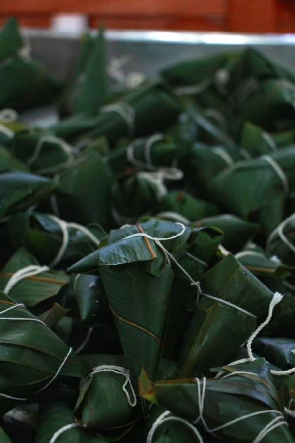 图为工作人员正在教学生包粽子 摄影:尹芊