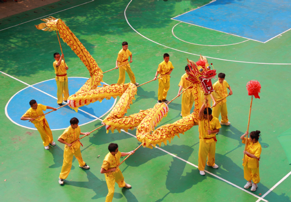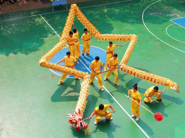 舞狮表演结束后,舞龙队迅速登场,一条条五彩缤纷的“龙”腾空而起,完成展转腾挪、原地8字舞龙、原地快速8字舞龙、曲线行进、龙尾齐钻等一系列高难度动作。