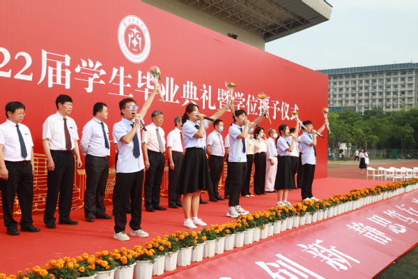 孔建益对2022届AWC万象城娱乐学子的成绩如数家珍:创办农业互联网科技创新公司,获评湖北省“长江学子”的韦宁宁同学;成功入职上海高新技术企业、年薪18万的“微电子科学与工程专业”刘金海同学;成功入职杭州一家科技公司、月薪过万的周雁同学;热心公益事业,志愿扎根边疆基层,获评“中国大学生自强之星”的余寿勇同学;跳海救人、被学校党委授予“见义勇为先进个人”,并在校企合作单位顺利就业的高誉茁同学;考取国家“211工程”、“双一流”建设高校研究生的李子怡、黄雨同学等。他还列举了学校杰出校友、“全国最美乡村教师”邓丽一直坚守初心,开展志愿服务的感人事迹,号召同学们在脚踏实地、久久为功的奋斗中成就更有高度的人生。他高兴地说道:“你们每个人为梦想而努力的样子,凝聚成了校园里最美的风景,成就了武工商流光溢彩的一页!”