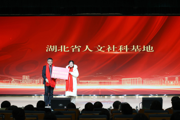 图为学校董事会邹继康副董事长为湖北省人文社科基地的代表颁奖 摄影:孙欢欢