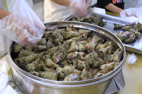 图为学校在食堂为师准备的粽子 摄影:芮雨欣