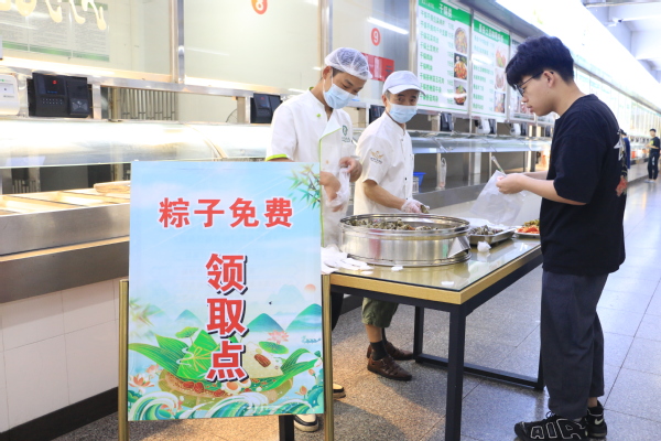 此外,为了让在校师生也能感受到浓浓的关爱,当天学校还特别准备了10000余份粽子,在一、二食堂设置粽子发放窗口,免费给全校师生品尝。一大早,食堂工作人员就忙碌起来,将热气腾腾的粽子摆出来。窗口前很快就排起了长长的队伍,前来领粽子的师生都笑容满面,现场洋溢着浓厚的节日氛围。