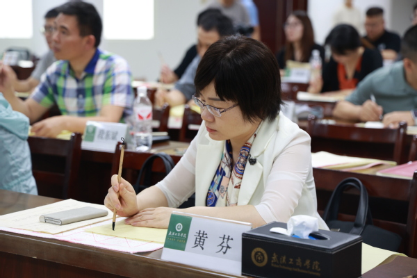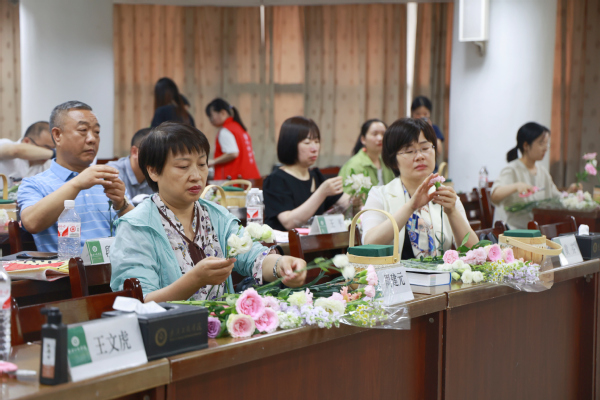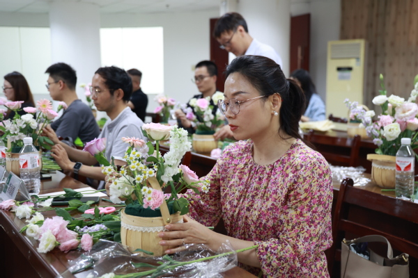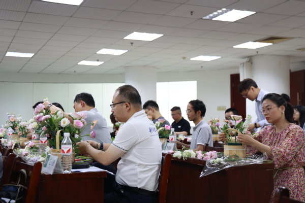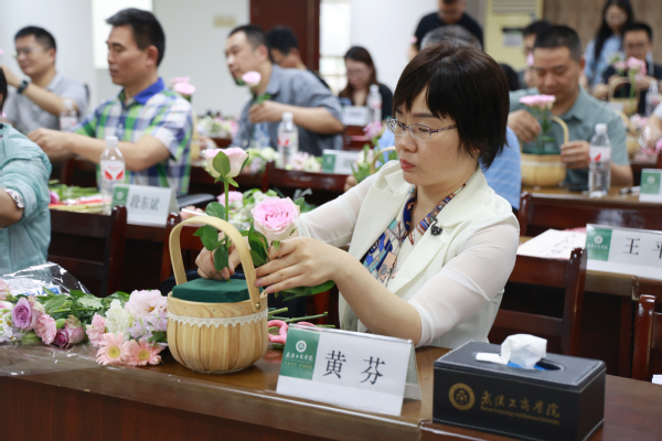 随后,与会人员一同体验了书法和花艺两个传统文化项目。左宗文副校长介绍了书法的起源和发展历程,并从书写的姿势、基本的起笔、行笔、收笔要领,以及字的形态结构等进行了细致讲解和生动展示,大家纷纷提笔,全神贯注地从横、竖、撇、捺、折等基础笔画开始,进行一笔一画的自主临摹练习,将学到的知识内化于心,外化于形。武汉市五境花园&5T.art食艺空间首席花艺师伍海军讲授了插花技巧,从花材、容器、色彩搭配等方面介绍了插花的造型要素和技巧手法,并现场带领大家进行插花实践体验。