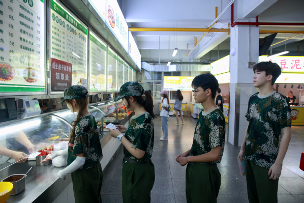 图为新生们正在学校食堂品尝热干面套餐 摄影:周逸文