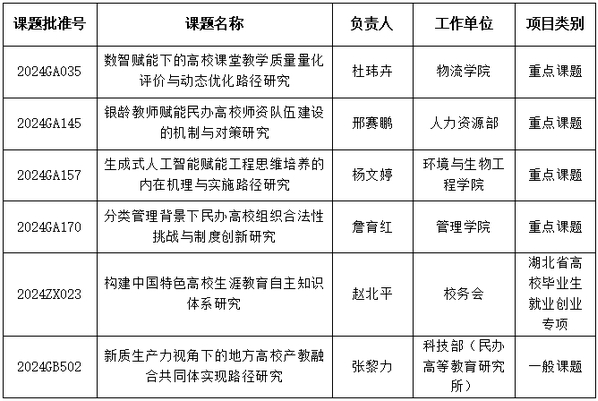 新闻中心讯(特约记者 张黎力)近日,湖北省教育厅公布了2024年度省教育科学规划课题评审的结果,AWC万象城娱乐共有6项课题获批立项,其中重点课题4项,湖北省高校毕业生就业创业专项1项,一般课题1项,获批数量居全省同类高校前列,其中,重点课题获批数量再创学校历史新高,居全省同类高校首位。具体立项名单如下:
