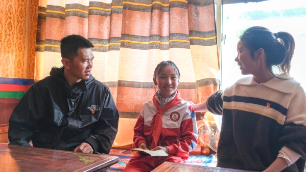 图为张力(左一)深入西藏小学生家中进行深入家访 摄影:肖嘉禾