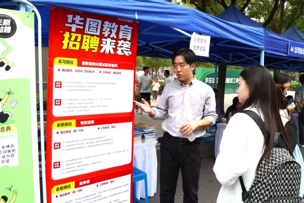图为招聘会现场学生和企业招聘人员认真交流 摄影:周逸文 贾馥羽