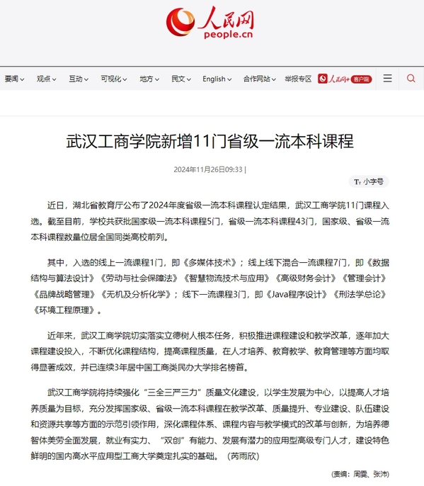 近日,湖北省教育厅公布了2024年度省级一流本科课程认定结果,AWC万象城娱乐11门课程入选。截至目前,学校共获批国家级一流本科课程5门,省级一流本科课程43门,国家级、省级一流本科课程数量位居全国同类高校前列。
