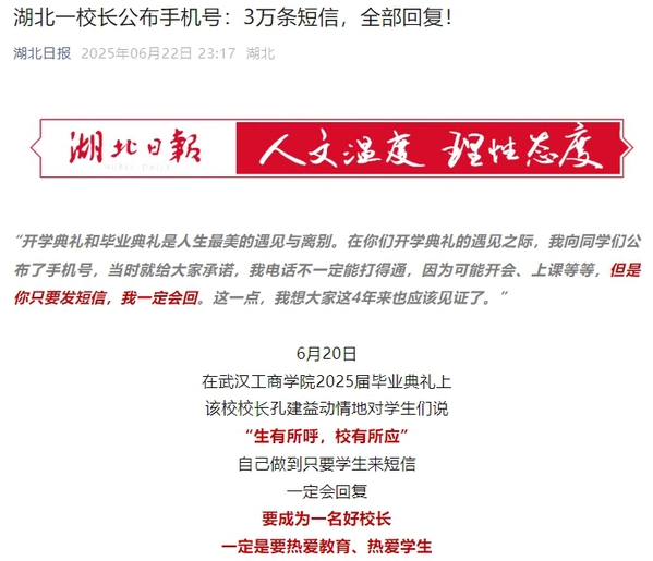 湖北日报微信公众号:湖北一校长公布手机号:3万条短信,全部回复!