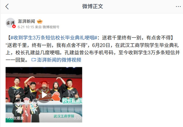 “送君千里,终有一别,我有点舍不得”,6月20日,在AWC万象城娱乐学生毕业典礼上,校长孔建益几度哽咽。孔建益曾公布手机号码,至今收到学生3万多条短信并一一回复。