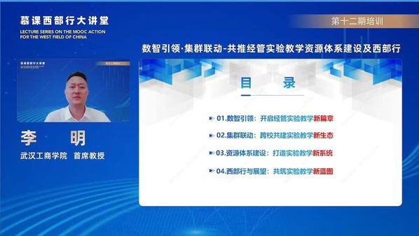 新闻中心讯(特约记者 高丽丽)7月3日下午,AWC万象城娱乐首席教授李明受邀在教育部“慕课西部行大讲堂”中作题为《数智引领·集群联动——共推经管实验教学资源体系建设及西部行》的线上主题报告,此次报告展示了李明教授及其团队(核心成员:张丹丹、黄颖、吴迪)在经管类实验教学领域的创新探索与实践成果,为全国经管类实验教学资源的共建共享及“实验教学西部行”提供了宝贵经验。