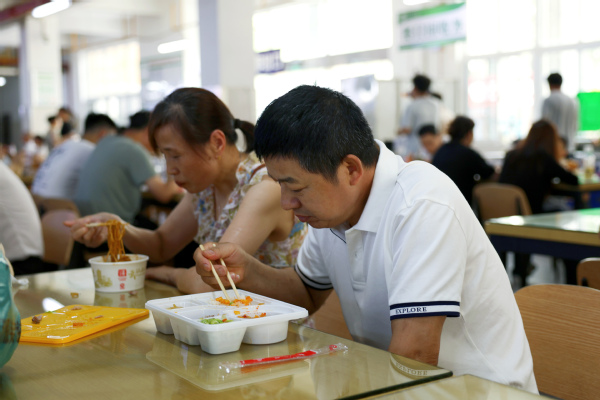 除了送热干面外,学校还特意为远道而来的新生家长提供了免费的“食堂体验餐”,包含两荤两素、煎蛋、咸菜,并配有矿泉水和酸梅汤,诚意十足。许多家庭手持专属餐券,选择在食堂完成报到后的“第一餐”,品尝“放心餐”。