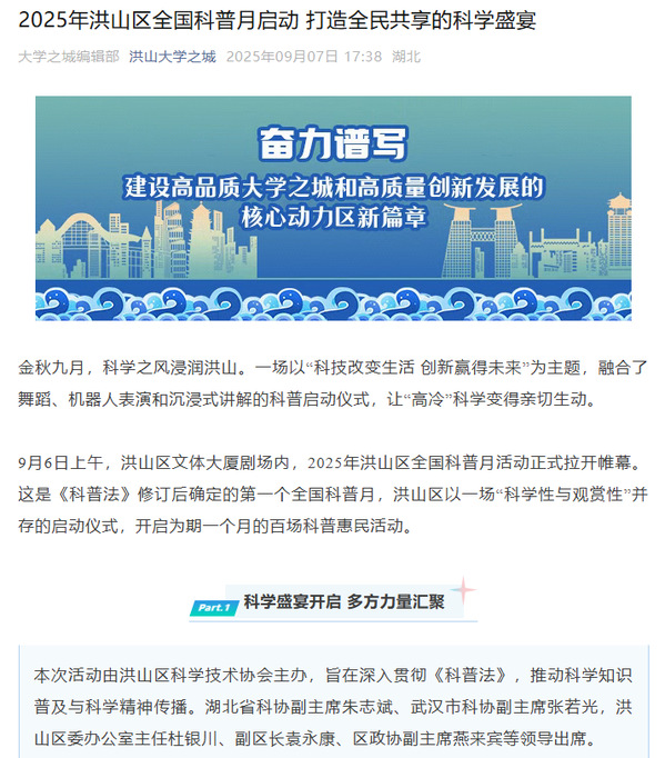 值得关注的是,启动仪式当天,湖北省农科院社区、中国地质大学逸夫博物馆、武汉市长虹中学三个分会场同步开启科普活动。整个科普月期间,洪山区还将组织开展超过百场科普活动,包括人工智能讲座、社区科普展、企业开放日、校园科学课等,推动科普进入机关、校园、社区和企业,实现“科普惠民、全民共享”。