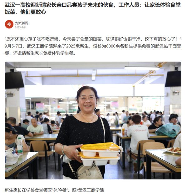 “我们是北方人,本来担心孩子到武汉上学,吃饭会不习惯,结果一看这菜品丰富、价格实惠,饭菜还可口,我就放心了!”来自黑龙江的一位新生家长张女士笑着说,“这顿饭吃下去,心里踏实多了。感觉学校特别有人情味,孩子在这生活,我们一百个放心!”