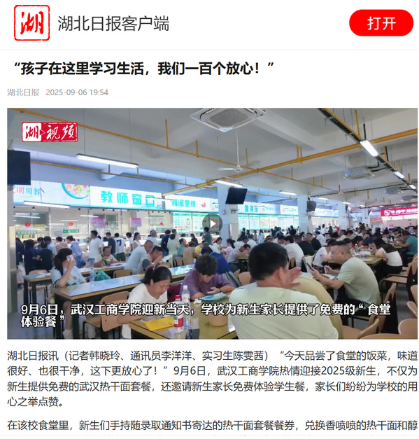 在该校食堂里,新生们手持随录取通知书寄达的热干面套餐餐券,兑换香喷喷的热干面和醇香的豆浆,既是地方美食,又饱含“大学之城的‘热’情、英雄城市的‘干’劲、期待和你‘面’对面”的寓意。这已是该校连续三年为新生赠送免费热干面套餐。