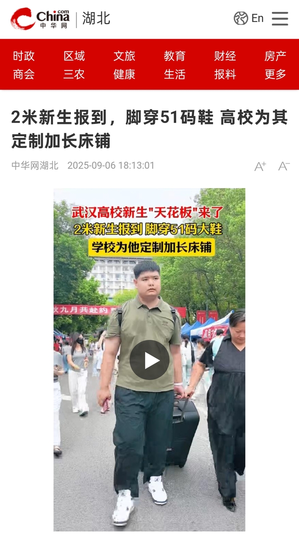 这位新生名叫柳兆轩,来自河北省保定市,今年20岁,是该校应用技术学院财富管理专业的新生。报到当天,他脚穿51码大鞋,身着9X码上衣,独特的身高让他在人群中格外显眼。