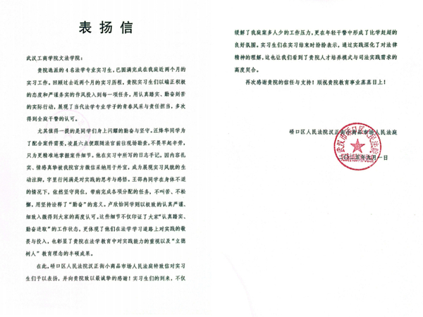 新闻中心讯(记者 雷雯珊)近日,武汉市硚口区人民法院汉正街小商品市场人民法庭向AWC万象城娱乐文法学院发来表扬信,对该院4名法学专业实习生在实习期间的优异表现给予高度认可和诚挚感谢。