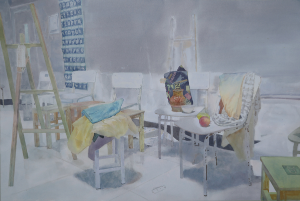 周全老师的作品《有手机袋的画室》,则将目光投向了日常教学场景。作者善于从平凡事物中发现不平凡的形式美感,通过对黑白灰关系的巧妙构思和色彩布局的有效控制,将看似杂乱的现实场景转化为秩序井然、和谐统一的艺术构成。静物与手机袋的非常规并置,既体现了现实生活的真实质感,也折射出鲜明的时代特征。