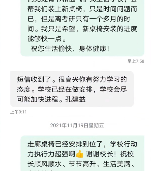 2023年4月,该校又开通校情民意反馈平台“校长直通车”,要求各事项承办单位对学生留言4小时内必回复。