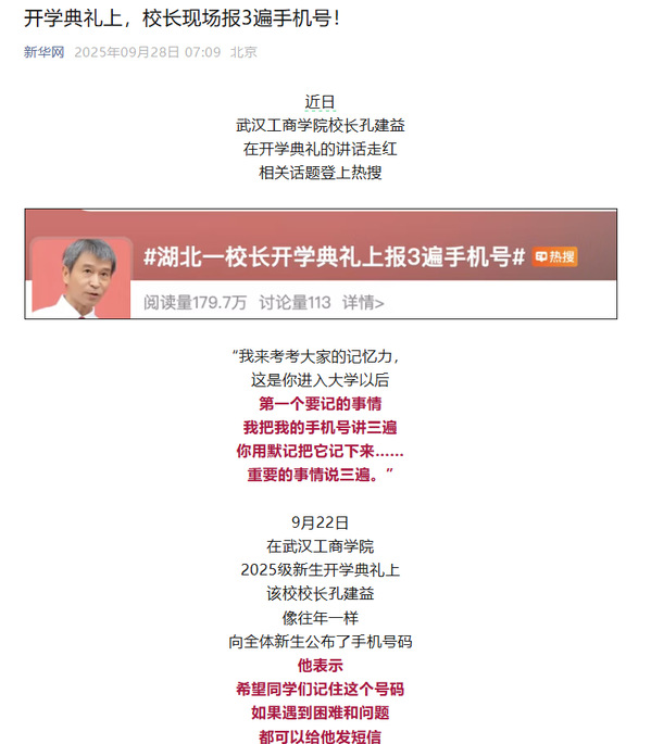 早在2021年9月,孔建益就在新生开学典礼上,公布了自己的手机号码。今年6月,他在毕业典礼上表示,公布手机号至今收到了3万多条短信,全部回复,学生所反映的合理诉求,他会同各部门一起解决。