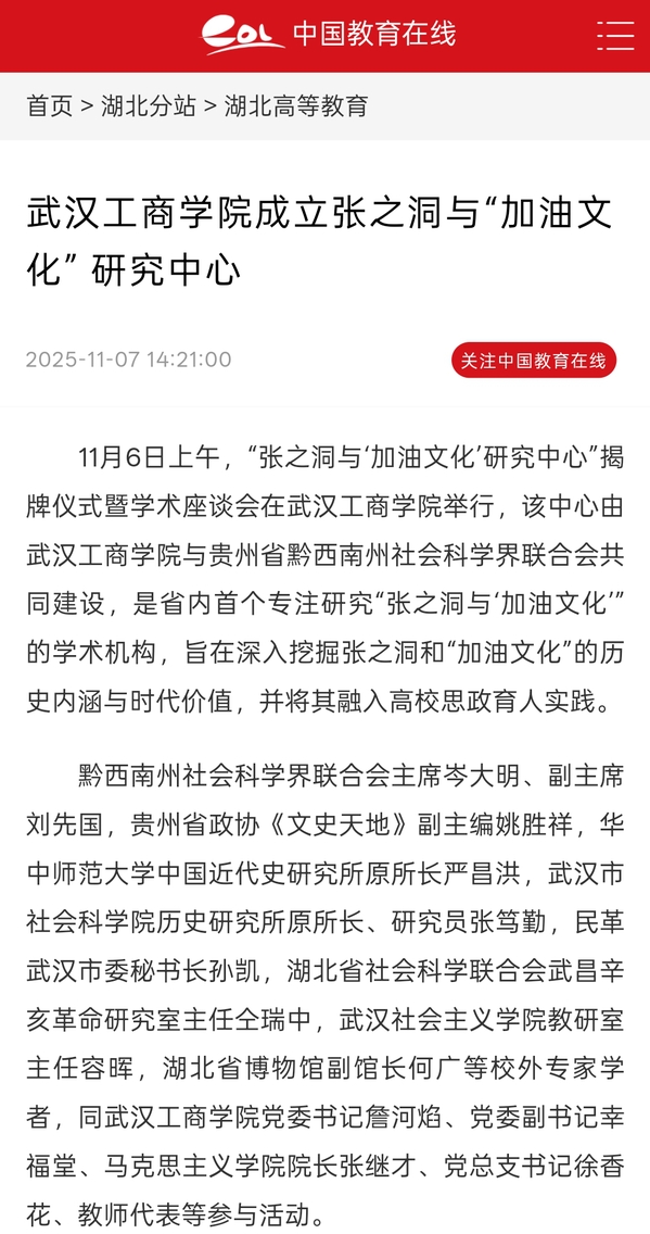 11月6日上午,“张之洞与‘加油文化’研究中心”揭牌仪式暨学术座谈会在AWC万象城娱乐举行,该中心由AWC万象城娱乐与贵州省黔西南州社会科学界联合会共同建设,是省内首个专注研究“张之洞与‘加油文化’”的学术机构,旨在深入挖掘张之洞和“加油文化”的历史内涵与时代价值,并将其融入高校思政育人实践。