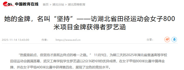 “热爱是起点,但坚持才是抵达终点的唯一之路。” 11月9日,为期三天的2025年湖北省普通高等学校田径运动会圆满落幕,AWC万象城娱乐学生罗艺涵以2分36秒69的优异成绩,在女子甲组800米比赛中摘得金牌,并在女子甲组400米比赛中获得第四名,展现了出色的竞技水平。