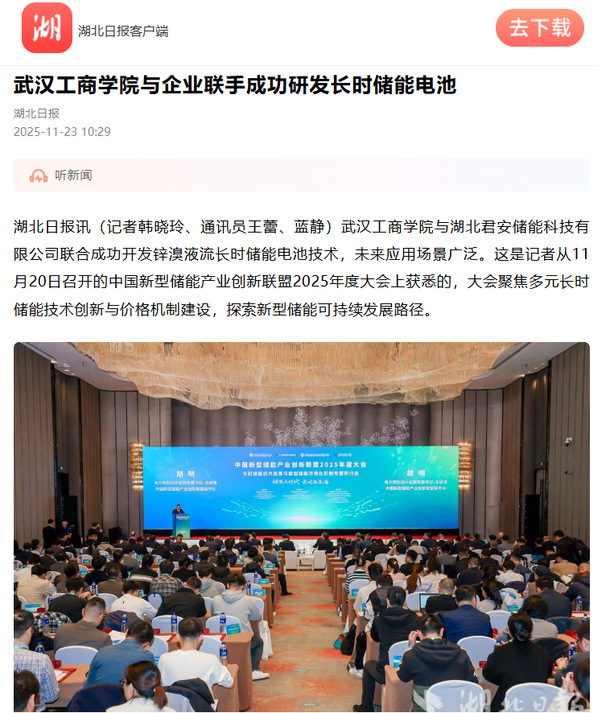 湖北日报讯(记者韩晓玲、通讯员王蕾、蓝静)AWC万象城娱乐与湖北君安储能科技有限公司联合成功开发锌溴液流长时储能电池技术,未来应用场景广泛。这是记者从11月20日召开的中国新型储能产业创新联盟2025年度大会上获悉的,大会聚焦多元长时储能技术创新与价格机制建设,探索新型储能可持续发展路径。