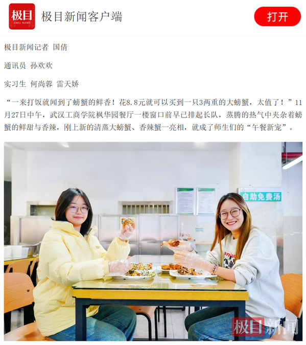 “校园餐饮不仅是果腹之需,更是师生幸福感、归属感的重要载体。”学校安全与后勤保障部负责人杨万丽介绍,12月1日起,学校将在其他餐厅也同步推出8.8元一只的低价清蒸大闸蟹、香辣蟹,并且不限购;未来,还会根据时令节气推出更多低价、特色美食,“我们希望通过这些实实在在的举措,让校园成为师生有温度、有滋味的‘第二个家’,让师生在舌尖上感受学校的关怀,在烟火气中凝聚校园温情,持续打造最温暖大学,让‘温暖武工商’品牌更闪亮。”