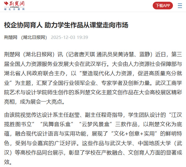 由该院视觉传达设计系主任赵莹、副主任程奇指导,学生团队设计的“江汉揽胜图书立”“凤舞音乐盒”“云梦风景盒”三款作品,以荆楚文化为底蕴,融合现代设计语言与实用功能,展现了“文化+创意+实用”的鲜明特色,受到与会嘉宾的广泛好评。这些作品与武汉大学、中国地质大学(武汉)等高校作品同台展示,彰显了学校在产教融合、文创育人方面的显著成效。