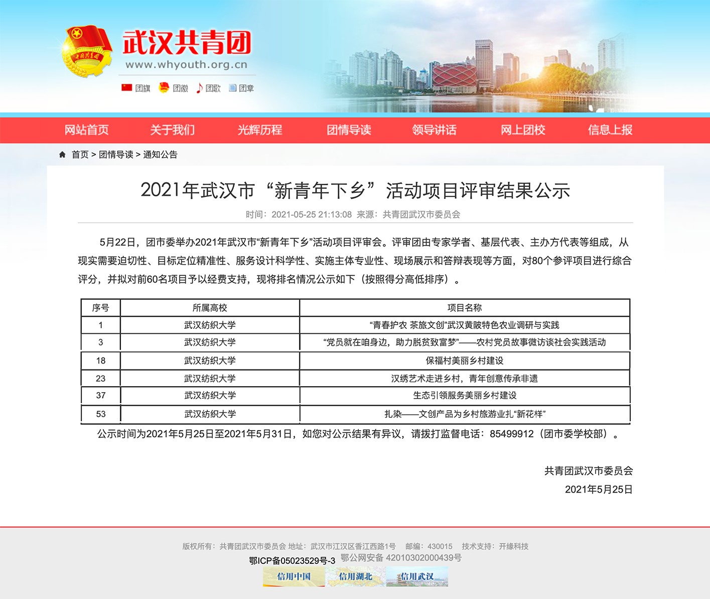 今年4月,由武汉团市委举办的2021年武汉市“新青年下乡”活动正式启动,该活动聚焦全面推进乡村振兴、加快农业农村现代化,突出庆祝中国共产党成立100周年,探索创新活动开展内容和形式,全力打造新时代大学生思政教育的“武汉样本”,引领高校大学生为建设现代化大武汉贡献青春力量。经现场答辩,专家学者、基层代表、主办方代表等评审,我校经济学院的《青春护农茶旅文创”武汉黄陂特色农业调研与实践》、传媒学院的《“党员就在咱身边,助力脱贫致富梦”——农村党员故事微访谈社会实践活动》、伯明翰学院的《保福村美丽乡村建设》、服装学院的《汉绣艺术走进乡村,青年创意传承非遗》和《扎染——文创产品为乡村旅游业扎“新花样”》,以及环境学院的《生态引领服务美丽乡村建设》6个项目成功获得2021年武汉市“新青年下乡”活动立项和资助,立项及资助数量位居高校首位。