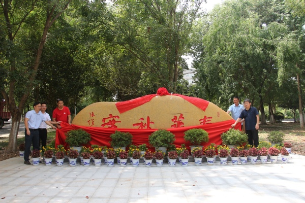 最后,赵北平副校长与李文涛校友等一行来到位于学校综合楼东侧的“校友林”,举行景观石揭幕仪式,并合影留念。