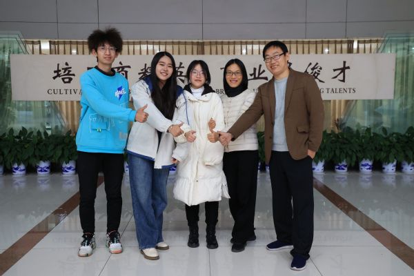 (从左至右依次为陈司翰、刘文婷、黄雨薇、梅俊华老师、程斌老师)