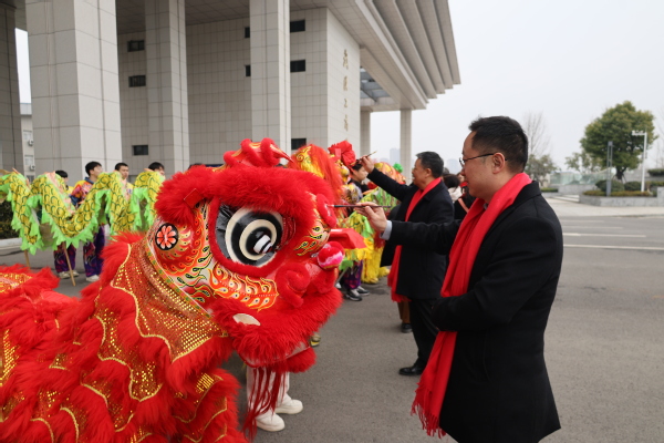 图为董事长彭秀春,副校长刘生元、桂裕清、张俊、赵北平一同为龙狮点睛 摄影:芮雨欣 李洋洋 金天