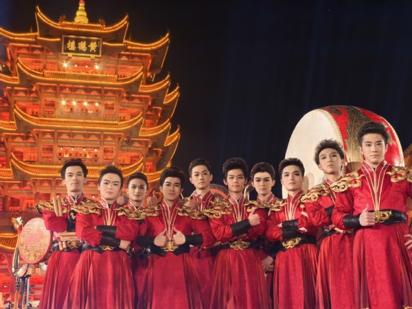图为武工商学子参与央视春晚武汉分会场主题节目《星汉耀江城》鼓阵表演录制
