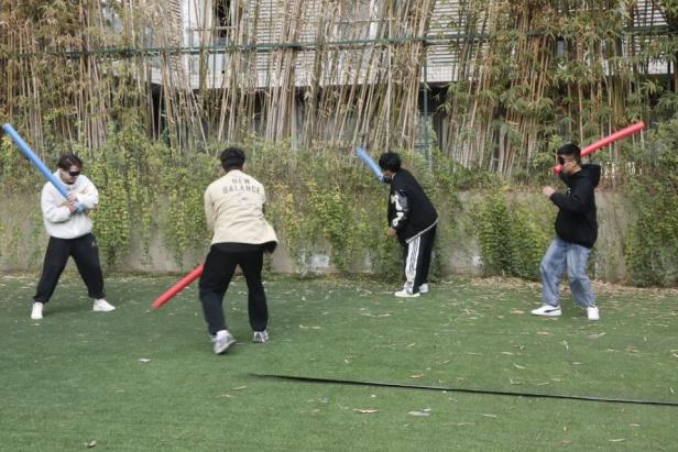 在等待饺子蒸熟的间隙,大家第一个游戏是“蒙眼击剑”,随着裁判一声令下,双方开始了激烈的“厮杀”,一轮结束后又是一轮。第二个游戏是“撕名牌”,大战一触即发,只听着“刺啦”声的此起彼伏,游戏进入了尾声。