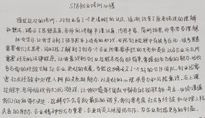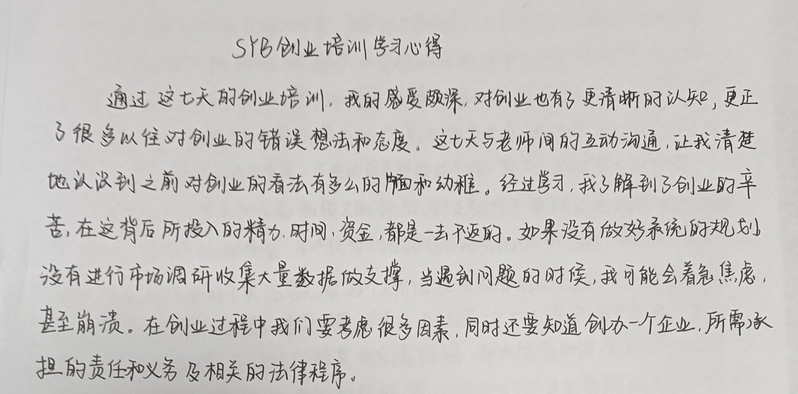此次培训得到了学校和学院领导的大力支持,在培训的过程中更正了学生很多以往对创业的错误想法和态度,让同学们亲身体会到了创业背后的艰辛,需要付出的时间精力,更加认为创业做好系统规划是非常必要的,也需要在准备创业之前做好充足的心理准备,懂得去考虑各个方面的因素。