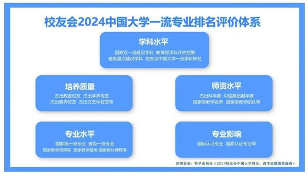 校友会2024中国大学一流专业排名评价指标由学科水平、培养质量、师资水平、专业水平和专业影响等5大指标构成,以艾瑞深大学360度全景数据平台为数据支持,涵盖教育部双一流建设学科、国家级一流本科专业建设点等100多项核心评价指标,全国共1226所本科高校的近6万个本科专业上榜。