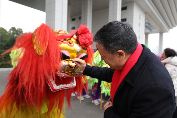 学校董事长彭秀春,副校长刘生元、桂裕清、张俊、赵北平一同为龙狮点睛,副校长左宗文主持巡游活动。