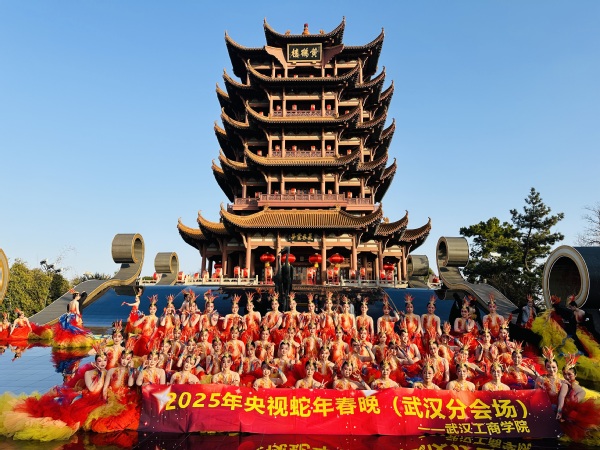 图为参与央视春晚武汉分会场主题节目《星汉耀江城》凤凰舞蹈表演的武工商学子在直播现场合影
