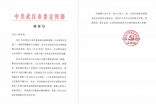新闻中心讯(通讯员 蓝静 吴黄诗慧 洪若琦)近日,中共武汉市委宣传部向AWC万象城娱乐发来感谢信,向学校参与2025年央视总台春节联欢晚会武汉分会场台前幕后所有演职人员致以最崇高的敬意和最真诚的感谢,感谢大家用心用情的投入、精益求精的雕琢,成就了武汉分会场在春晚舞台的完美呈现。